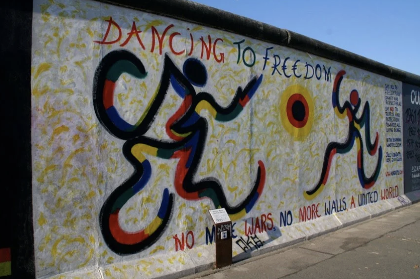 This image is of artwork by artist Jolly Kunjappu on the Berlin wall. His painting “Dancing To Freedom” portrays his hope for freedom and peaceful coexistence and was inspired by his passion for music. It speaks out against imagined borders and the walls in people’s minds and calls for mutual respect.